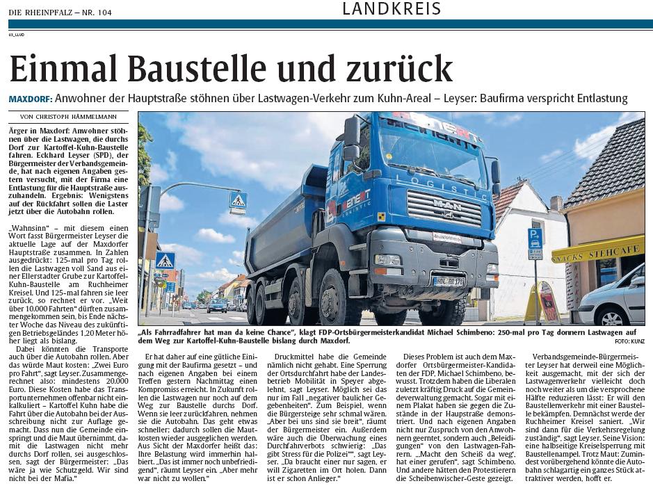 Protestaktion "Baustellenfahrzeuge raus aus Maxdorf" vom 04. Mai 2009" ruft Presse auf den Plan und sorgt für Transparenz für die Bürgerschaft |
